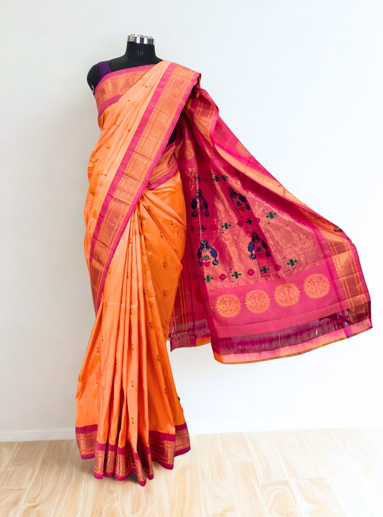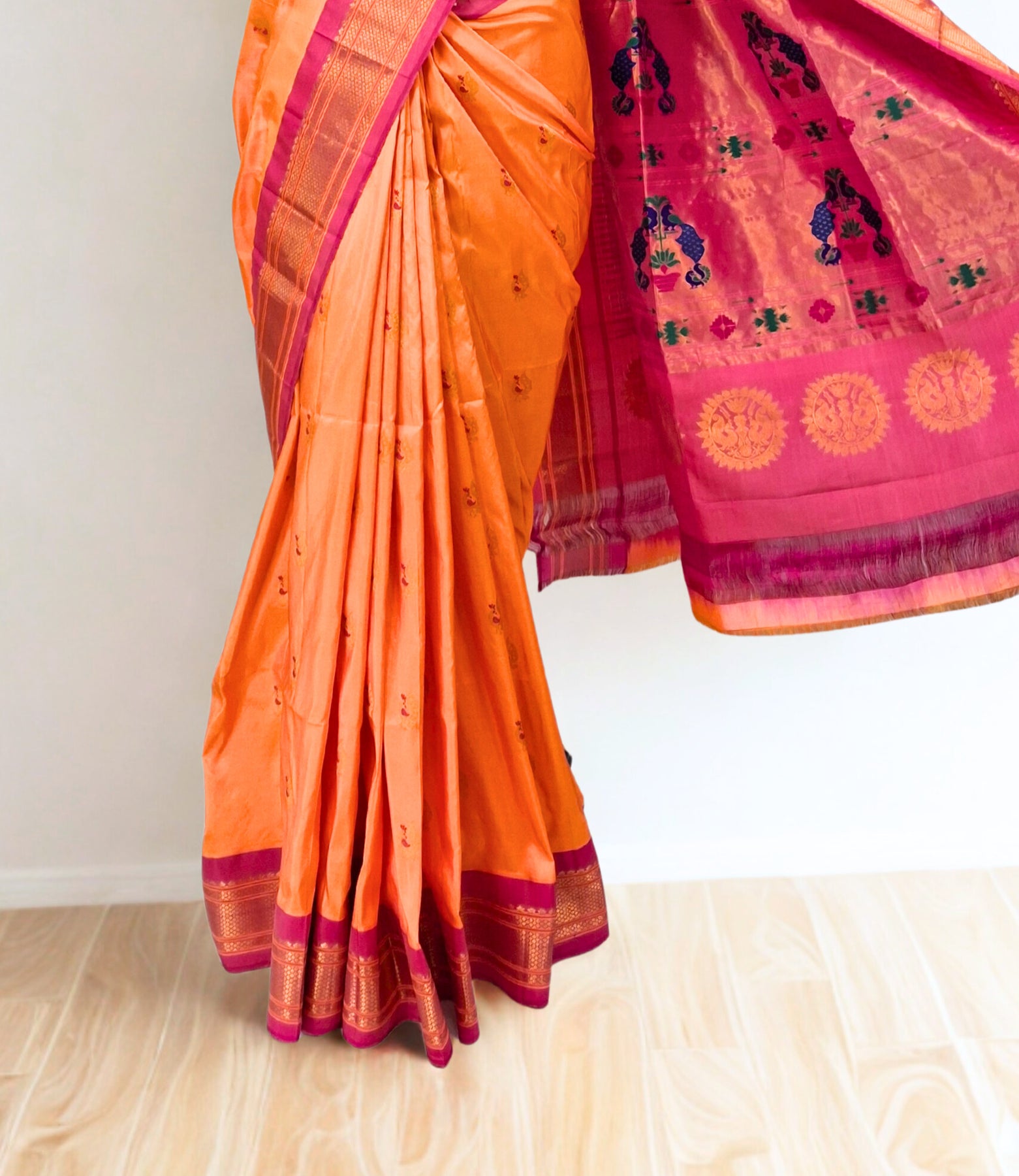 Perfect for weddings, festive celebrations, and cultural occasions, the Peach Pink Silk Paithani Saree with Peacock Butti is a timeless treasure that reflects the art of heritage weaving with modern elegance.