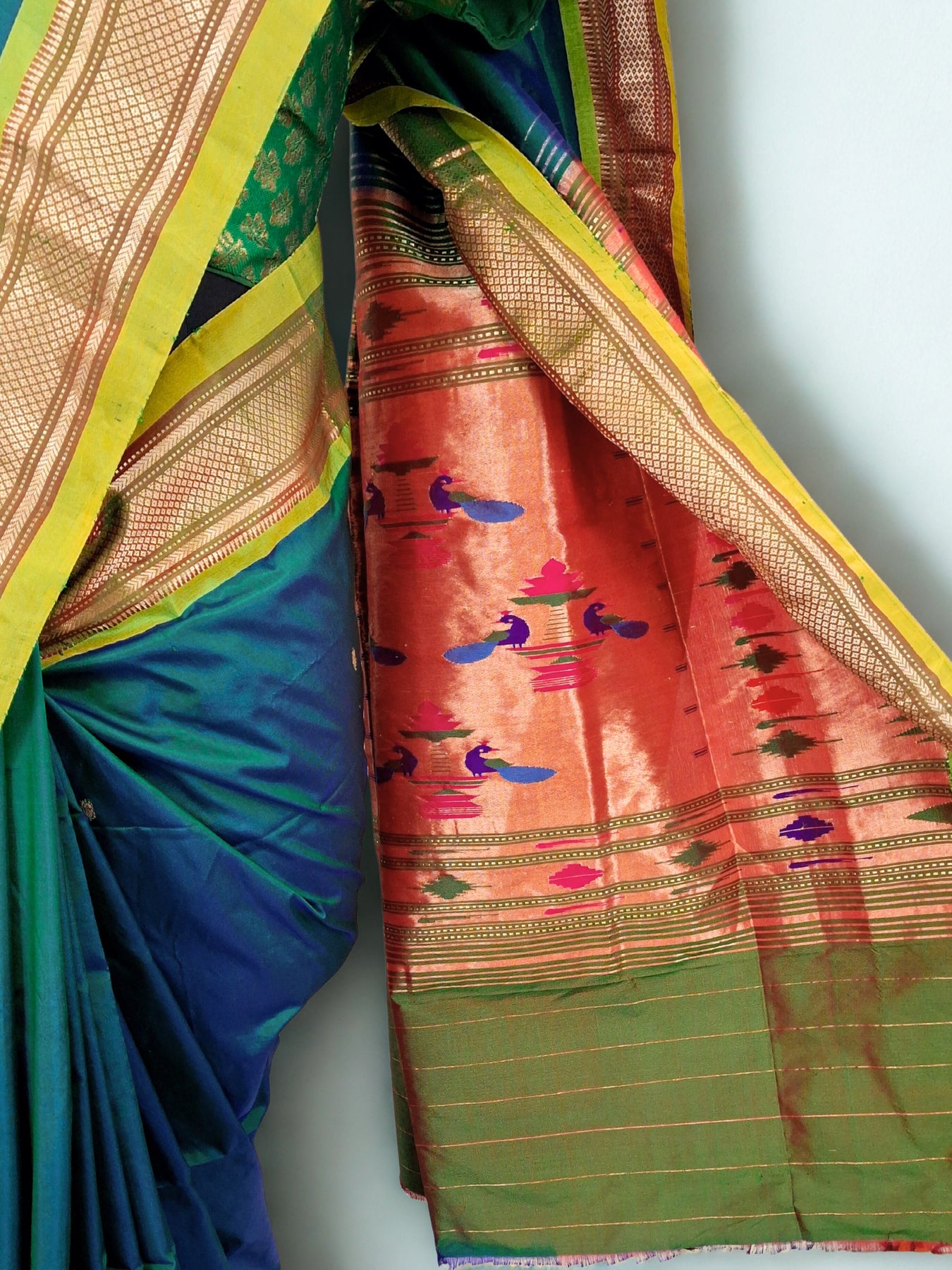 Graceful and eye-catching, this Peacock Green Silk Paithani Saree is a stunning ode to traditional elegance. The deep peacock green silk body shimmers with richness and depth, while the contrasting parrot green border brings a fresh, vibrant charm. Intricately woven with classic Paithani motifs in gold zari, the border and pallu feature beautiful peacock and floral designs, showcasing exquisite craftsmanship. Perfect for weddings, festive occasions, and cultural gatherings, this saree comes with a complementing blouse piece — a striking blend of regal color, heritage, and timeless sophistication.
