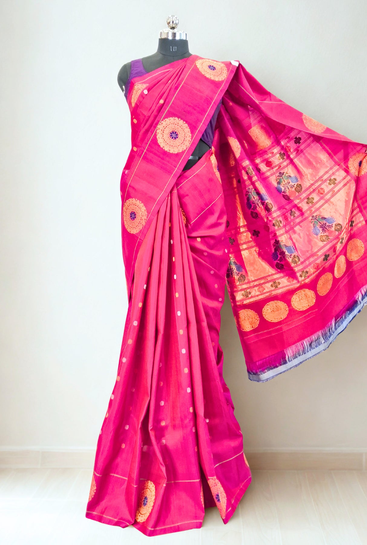 The Pink Rich Border Silk Paithani Saree is a graceful fusion of vibrant tradition and timeless elegance. Crafted from luxurious silk in a radiant pink hue, this saree exudes femininity and charm with every fold.