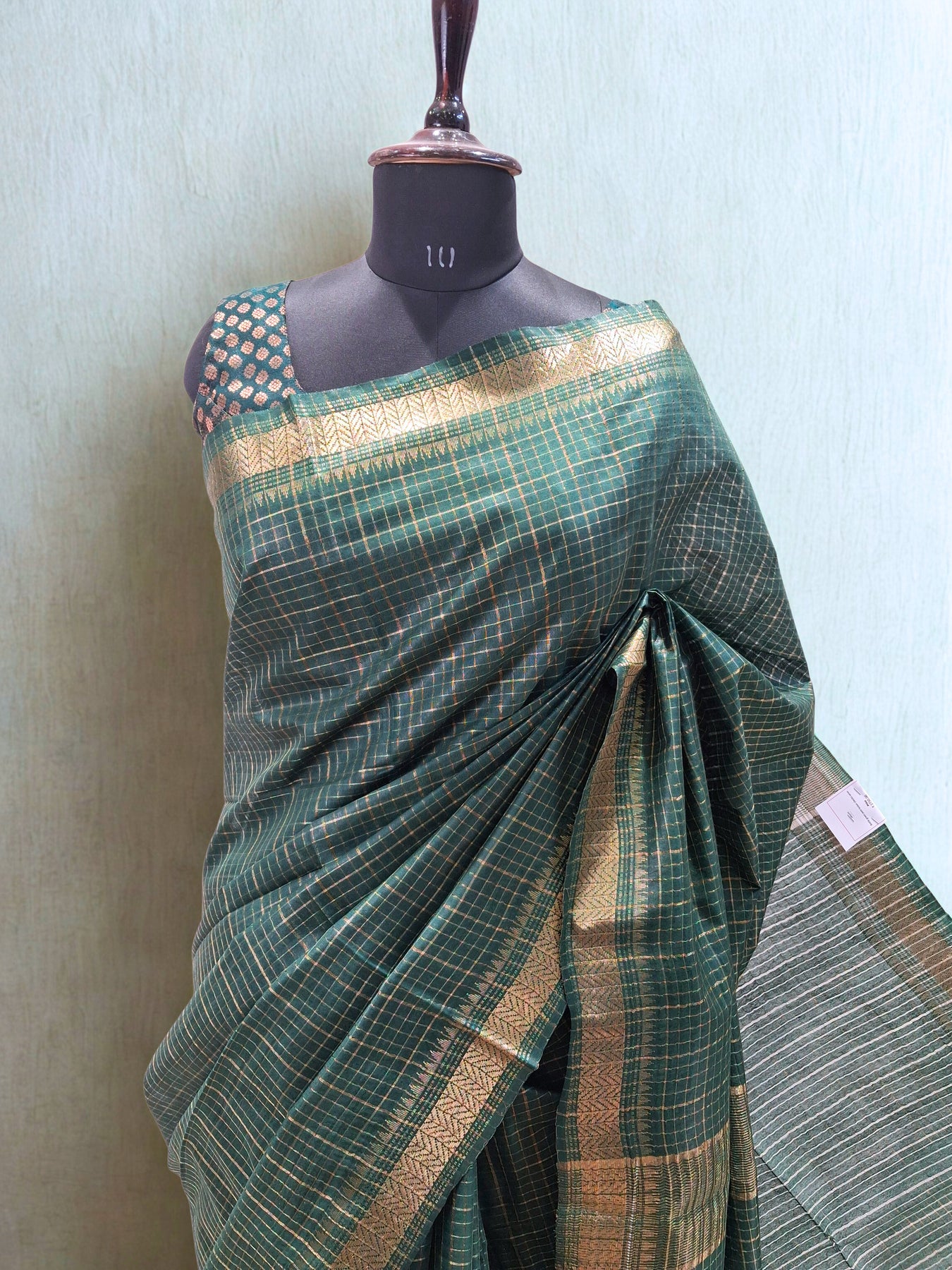 Elegant and enduring, this Bottle Green Semi Tussar Saree from the Rekhavali Collection is a graceful blend of structure and subtle shimmer. The deep bottle green hue lends a regal depth, beautifully elevated by finely woven zari checks that create a delicate grid of golden highlights across the body.