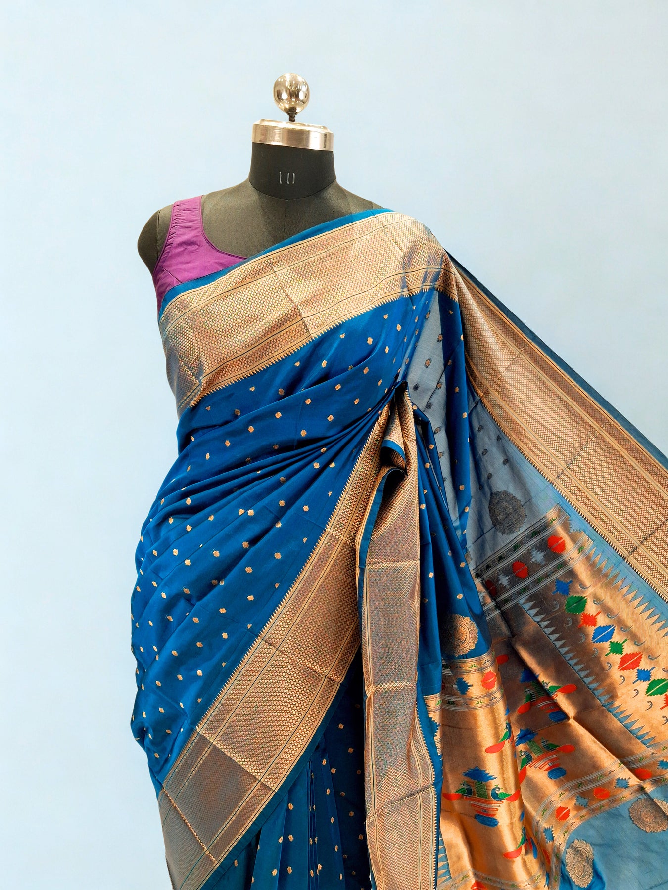 The highlight of this piece is its exquisite Paithani-style pallu, intricately woven with vibrant multicolored motifs that celebrate the heritage artistry of classic Paithani weaves. The combination of rich gold zari and colorful patterns creates a striking contrast against the deep teal base, adding depth and character to the saree.