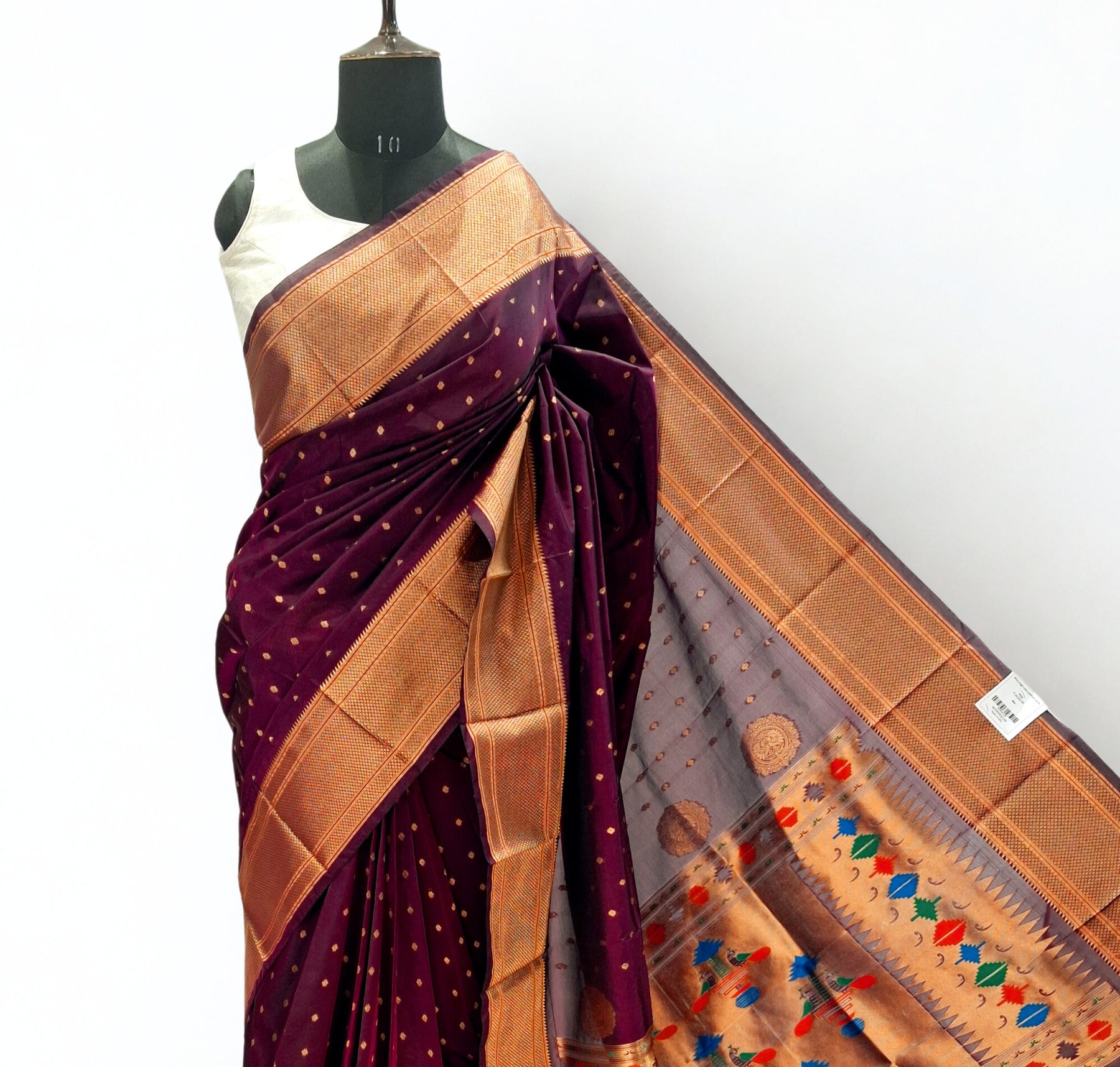 The highlight of this piece is its stunning Paithani-style pallu, intricately woven with vibrant multicolored motifs that celebrate the heritage of classic Paithani craftsmanship. The blend of radiant gold zari and colorful detailing creates a striking contrast against the rich wine base, making the saree both festive and sophisticated.