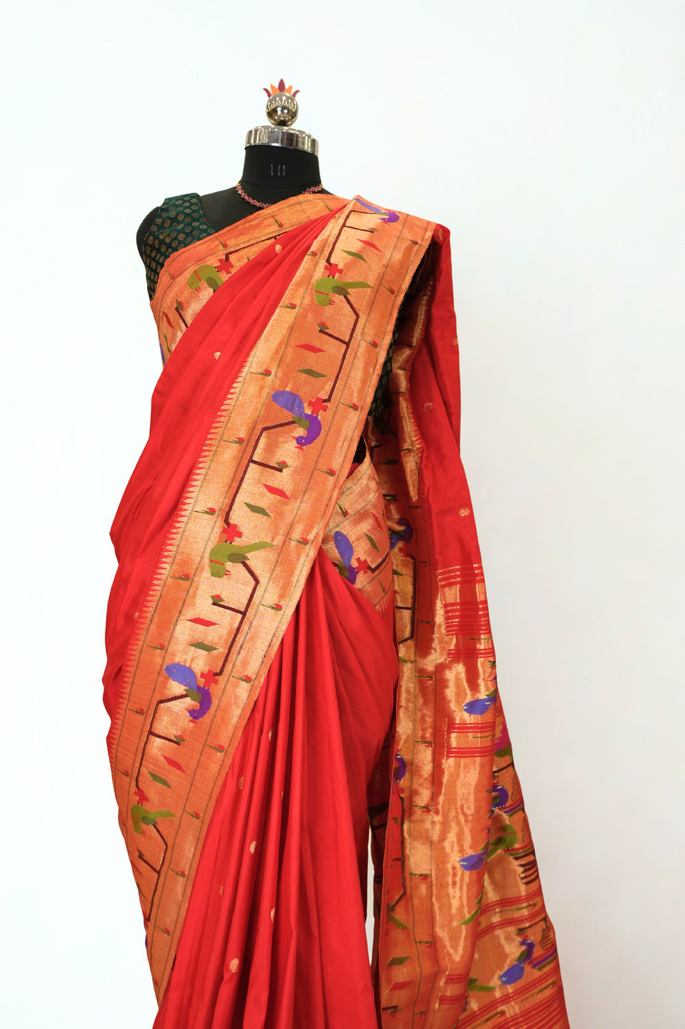 Make a striking statement with this Red Silk Paithani Saree, featuring a beautifully woven parrot and peacock border in rich zari. The vibrant red hue exudes timeless grace, while the intricate border adds a touch of traditional artistry. Perfect for weddings, festivities, and special occasions, this handwoven masterpiece celebrates the heritage of Paithani craftsmanship with elegance and charm.