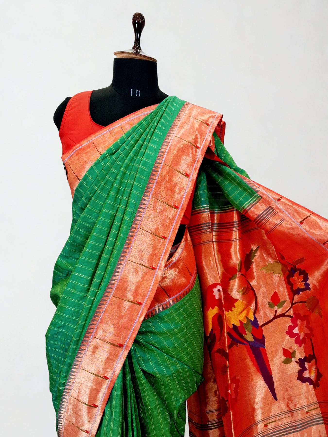 The Sea Green Checks Silk Paithani Saree is a graceful blend of elegance and tradition. Woven from premium silk, the body features delicate sea green checks, lending a subtle texture and charm.